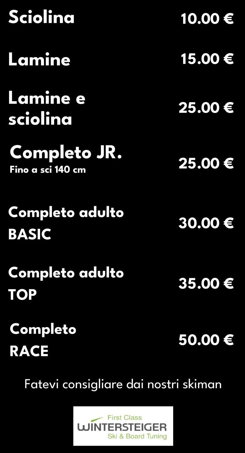 se lo sci ha la soletta in condizioni perfette si esegue la preparazione di lamine e sciolina. Consigliato se lo sci viene preparato spesso e si necessita solo di ravvivare le prestazioni.